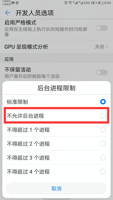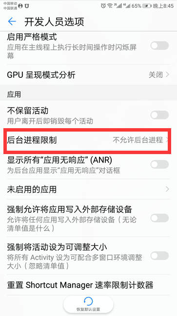 8、现在后台进程限制变成“不予许后台进程”了,手机后台应用就会关闭了