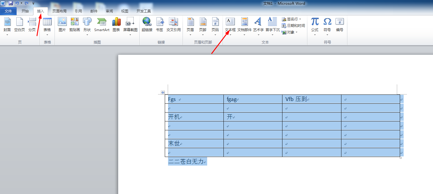 1、先随便插入一个表格,输入一些文字,包括表格外面也输入文字。