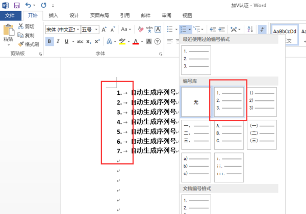 2、在开始栏,点击编号或者多级列表,则自动生成了序号,如下图: