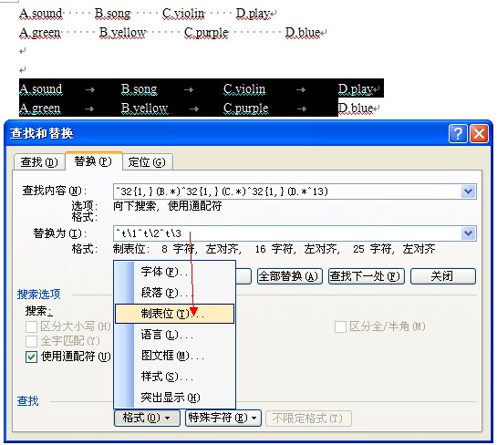 在替换为框中输入^t\1^t\2^t\3并且点击格式选择制表位,设置制表位的位置
