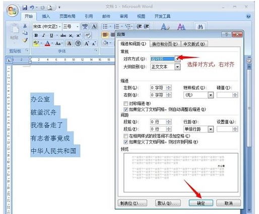 1、word中英文右对齐:选择要设置的文本或段落,“开始”菜单——段落,打开“段落”对话框,选择“对齐方式”为右对齐;
