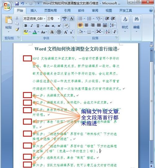 然后你可以全选→段落→首行缩进。这样就把全部的内容都设置为首行缩进了,如果文章的每一段的段首有全角空格,可在保持全选的状态下,按对中按钮2次,就去掉了全角空格了。
