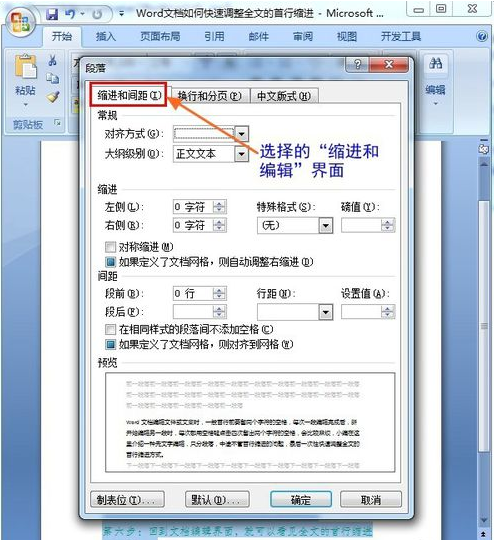 4、单击“段落”对话框中选择的“缩进和编辑”界面,如图所示: