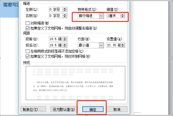 2、在弹出的段落设置框里,缩进选项右边的特殊格式选择“首行缩进”,磅值直接填上1厘米,然后点击下面的确定;