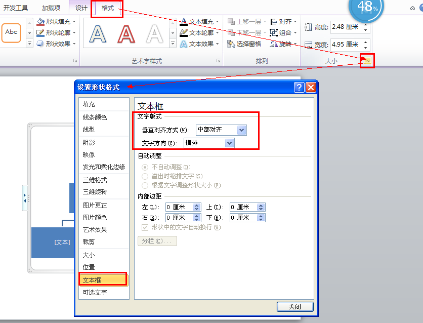 3、双击即会弹出如下图“设置形状格式“对话框,在该对话框中选择”文本框“把文字格式的对齐方式修改为”中部对齐“