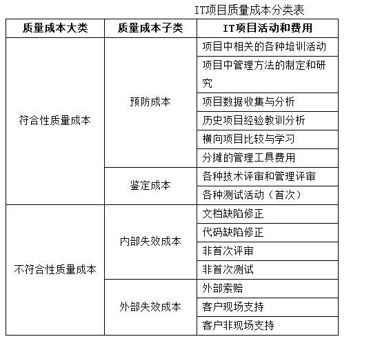 与其他行业相比较,IT项目的主要成本类型为人力成本,其成本科目构成较为单一,进行质量成本时可以将人力成本作为主要对象并折合为对应的费用,这种做法可以简化质量成本的分析过程。参考质量成本的四种类型和IT项目的特点,可以得到IT项目的质量成本分类表,如下所示。