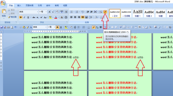1.打开word文档,单击“开始”菜单下的“显示/隐藏编辑标记”命令按钮,使分页符显示,如下图: