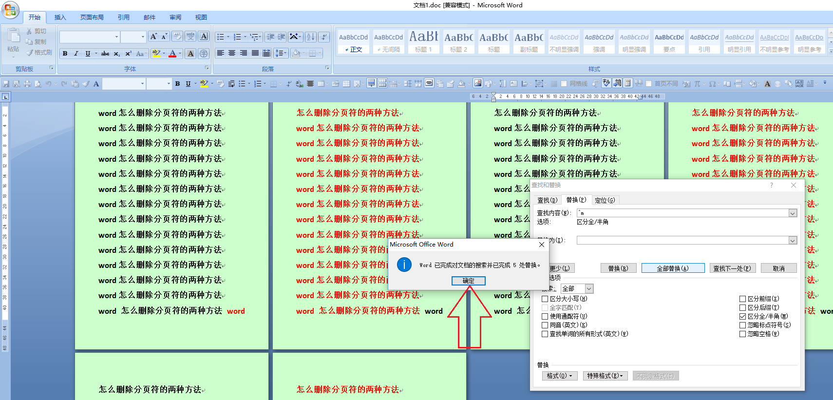 自动找到所有的分页符,并替换掉,点击“确定”,关掉剩下的界面,回到word编辑窗口中。