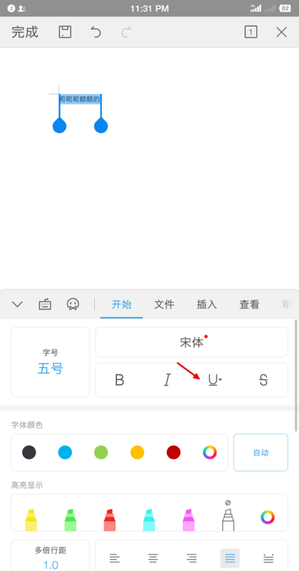 4.在功能页面中找到下划线选项,点击该选项为该段文字选择下划线,如下图所示。