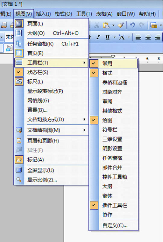 单击“视图”菜单下的“工具栏”,在列表中可以看到最上面的两个“常用”与“格式”,这两个工具栏是默认显示的,下面打勾的工具栏是根据个人需要或安装软件时默认勾选的工具栏。去掉前面的对勾则工具栏中相应的选项卡消失。反之,打上对勾则工具栏中增加相应的选项卡。