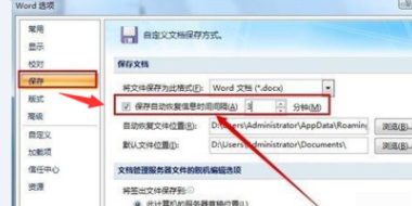 4、在“自动保存”选项卡界面设置Word文档自动保存的时间间隔后,就可以在Word崩溃后从以下Word恢复录中进行恢复操作了。