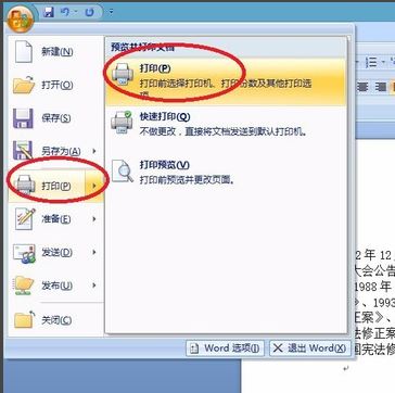 (1)在打开的Word文档中,单击【Office按钮】,执行下拉菜单中的【打印】命令(如图2所示),打开“打印”对话框。