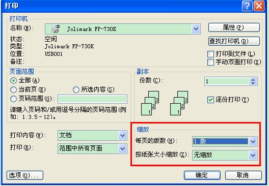 在“打印”窗口中,找到右下角“缩放”—“每页的版数”,在下拉列表中,选择要将多少页文档缩印到一页上。