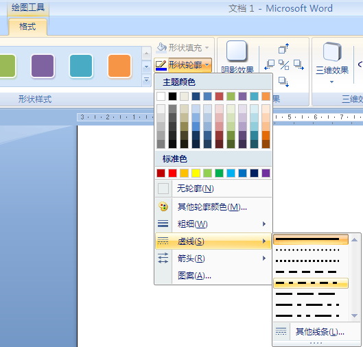 4、单击绘图工具格式----形状轮廓----虚线,在其后面的虚线型中选择一种所需要的即可,如图所示。