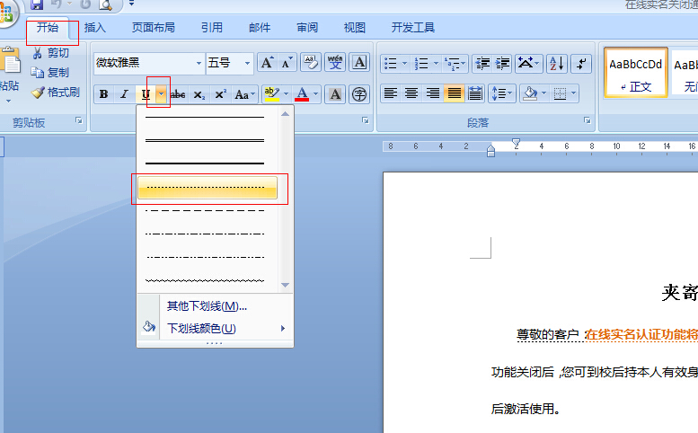 选择加入虚线的区域——开始——下划线下拉——选择需要的虚线样式,如图:
