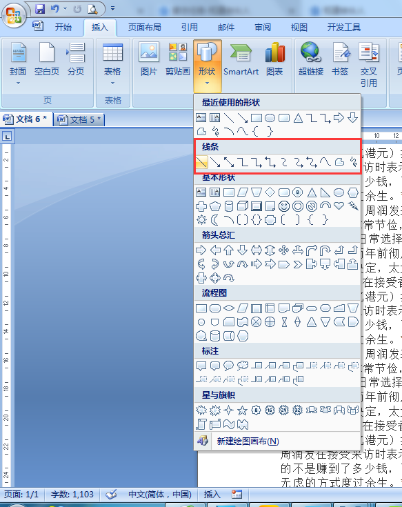 2、菜单栏中,选择“插入”——“形状”。在“线条选项下”选择第一个“直线”。