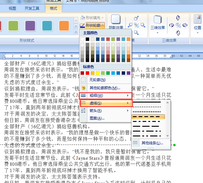 4、在菜单栏中选择“格式”——“形状轮廓”。在面板中调整线条粗细、调整实线为虚线,和虚线样式。