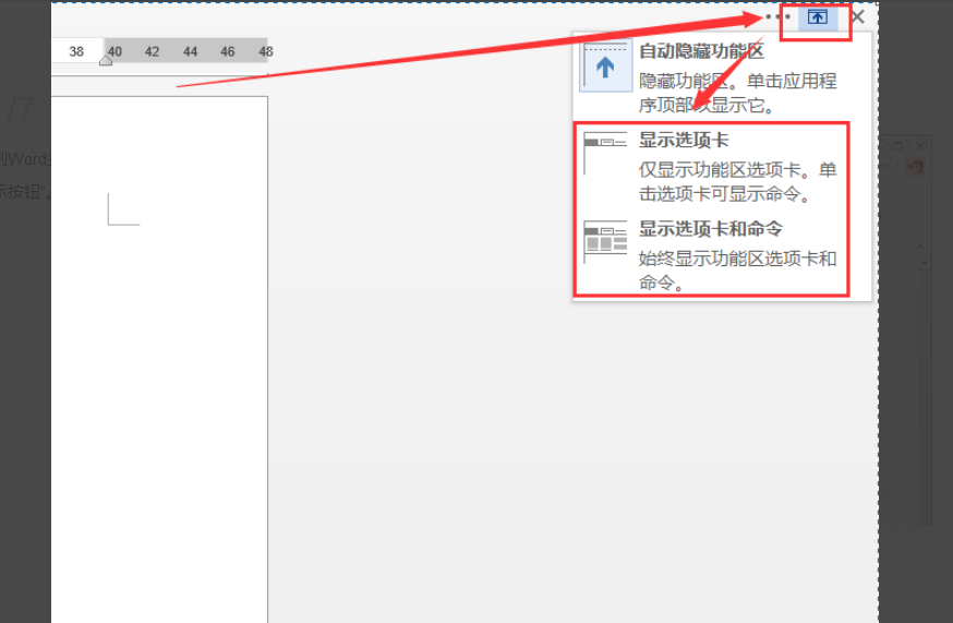 6、再次点击右上角“功能区显示选项”,在下拉菜单中选中“显示选项卡”或“显示选项卡和命令”,就能退出全屏显示了。