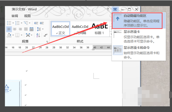 2、在下拉菜单中选中“自动隐藏功能区”。