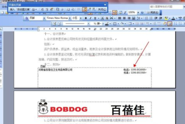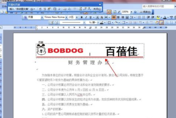 3、页眉编辑:比如在页眉里加入公司LOGO、和公司缩写,再在页眉下端画一横线以显美观。