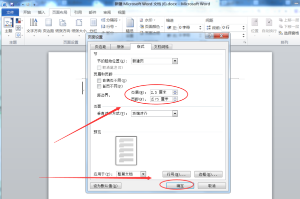 2、在“版式”标签页中,页眉页脚距边距的输入框中,输入需要调整的页眉页脚位置高度,并点击下面的确定按钮即可。