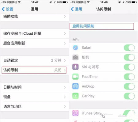 1、前面的步骤如同第一招,打开【设置】-【通用】-【访问限制】-【启用访问限制】。(此方法恢复后会打乱应用原有顺序,强迫症患者请谨慎使用)