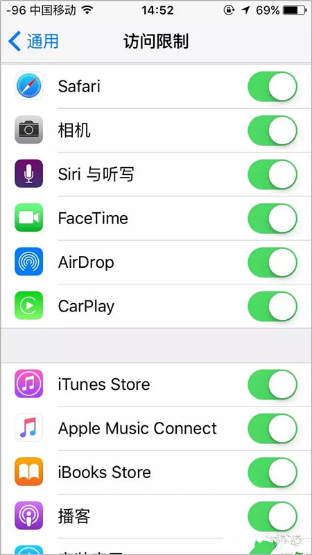 你回到主屏幕会发现你关掉的应用都消失了;不用担心它们被删除,它们仍然在你的设备上,只是不显示而已。想恢复原来设置的话,去“访问限制”里面,把它们全部开启就可以了。