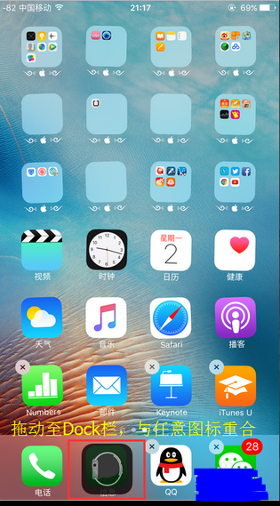 6.一直拖动到桌面下方的Dock栏,与上面任意一个App图标重合,然后松开手指;