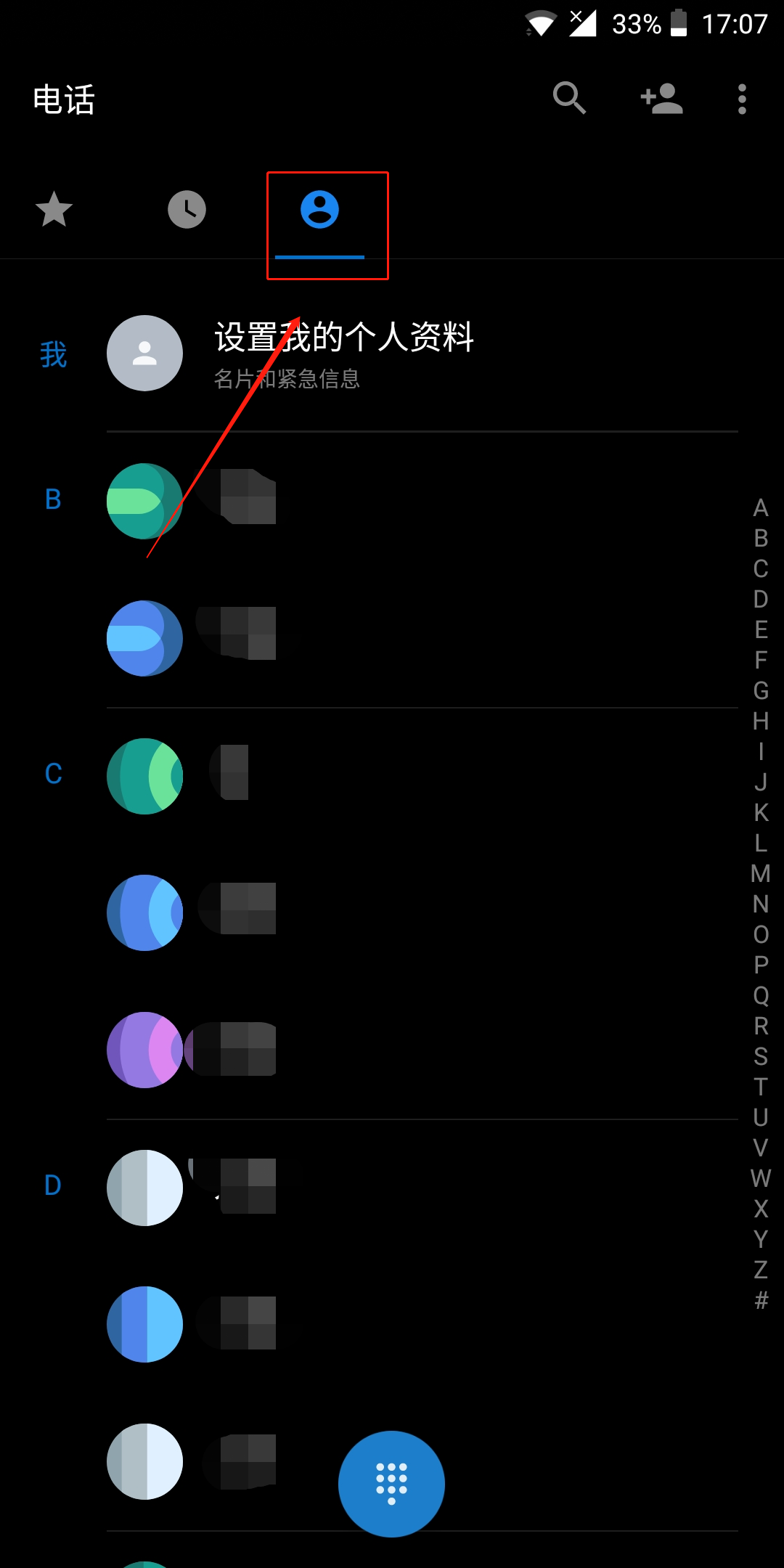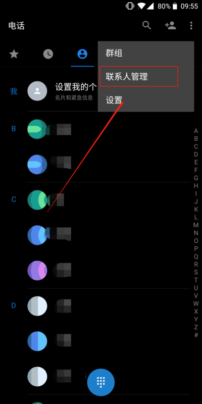 2.点击右上角的设置,找到“联系人管理”并点击进入。
