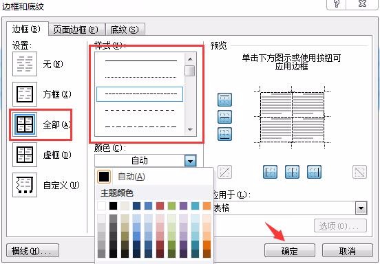 3、在边框选项卡中选择“全部”,同时在边框样式中选择“虚线”,以及边框线条的颜色、粗细值等,然后按“确定”按钮,如图: