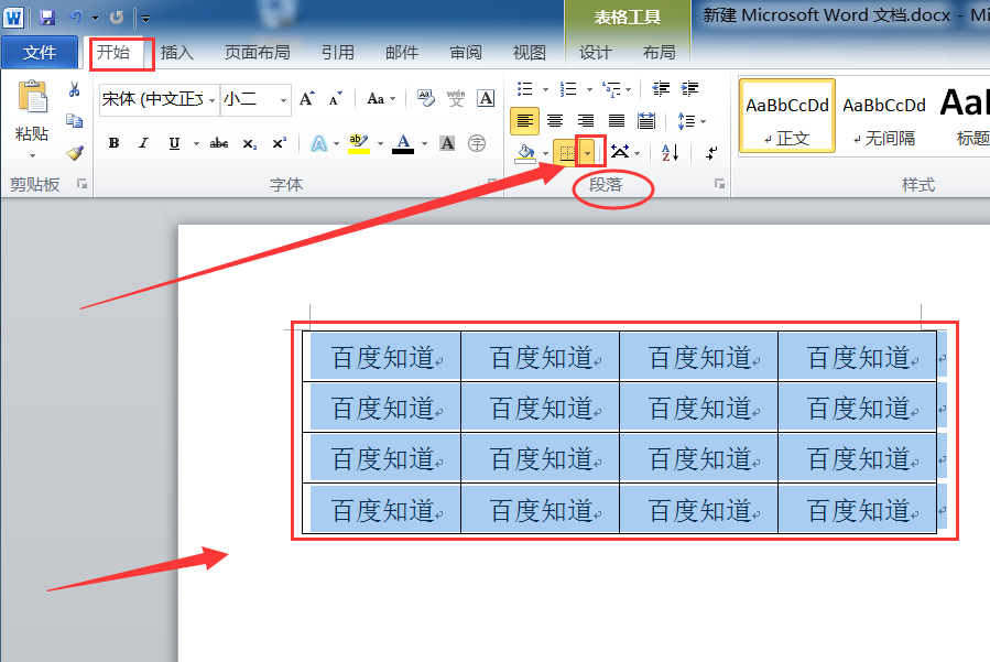 1、打开需要操作的WORD文档,鼠标选中需要改为虚线边框的表格,在“开始”选项卡找到“段落”,点击上方“边框”旁边的下拉按钮。