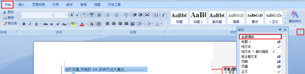 选中要清除格式的内容,单击“开始”,在“更改样式”中,点击右下角的小箭头,在出现的对话框中,选中“全部清除”。