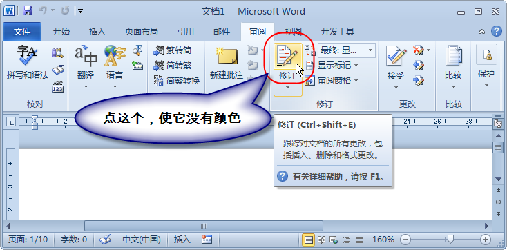 2007和2010:在“审阅”选项卡的“修订”组中单击“修订”按钮,使其成为弹起状态。