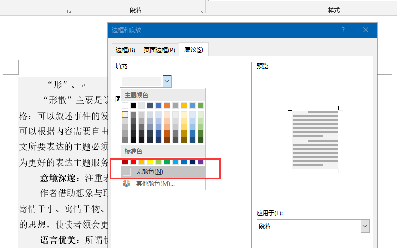 5、重新选中这些文字,重复上述步骤,将底纹中的填充颜色改为“无颜色”;