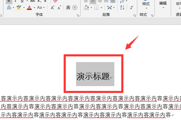 1、打开需要处理的word文档,将需要设为标题的文字用鼠标选中,这里以“演示标题”为例,选中后这些文字的背景色将会变成灰色: