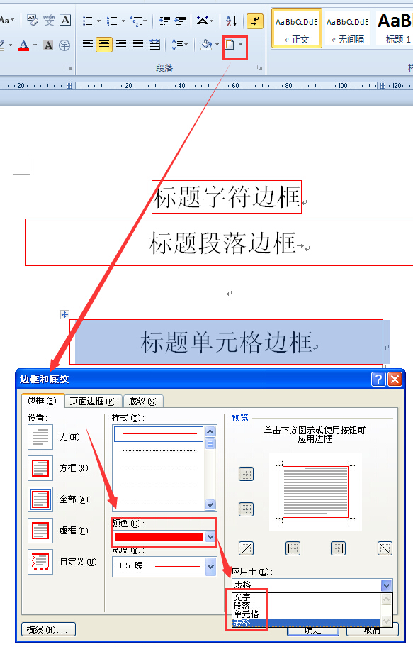 颜色选项中选择自己需要的颜色。应用于中会默认边框类型,不需要修改,然后点击确定即可。