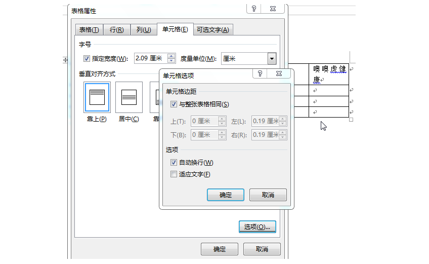 在Office word中没有自动换行是因为表格属性中单元格选项中的自动换行未勾选。