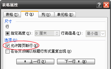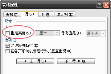 2、经常,设置好了“允许跨页断行”,Word 表格文字依然无法自动换页,则有可能是由于有人给单元格设置了固定行高所导致的。解决方法的操作同上,只要把表格属性设置中的行尺寸的“指定高度”前面框框里的勾去掉即可(如下图所示)。