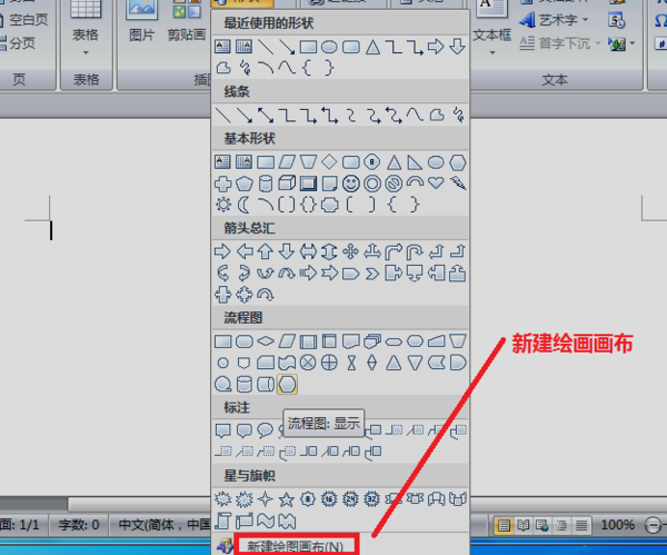 2、点击“形状”菜单选项后会出现一个下拉菜单,选中“新建绘画画布”进行点击。