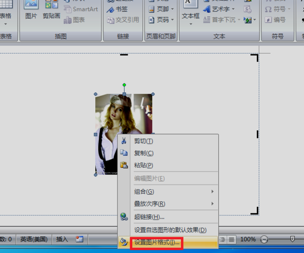 4、导入图片后,选中图片后点击鼠标右键,会出现一个菜单,选中“设置图片格式”选项。