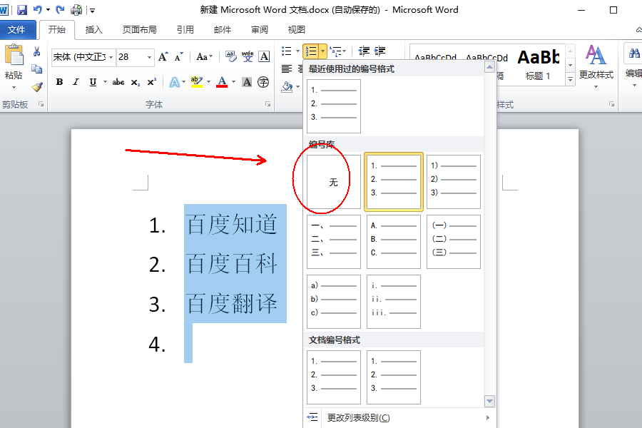 2、在弹出的编号库选项中,点击选择“无”即可。