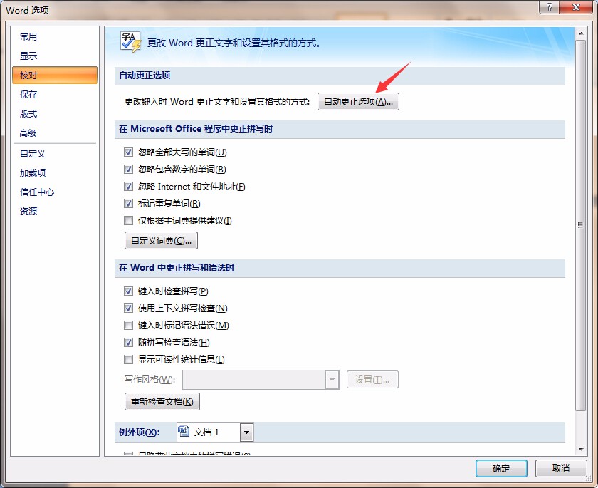 2、点击“自动更正选项”按钮,如图: