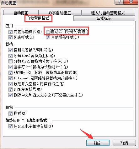 3、选择“自动套用格式”选项卡,同时把“自动项目符号表表”前面的勾去掉,然后按“确定”按钮,如图:
