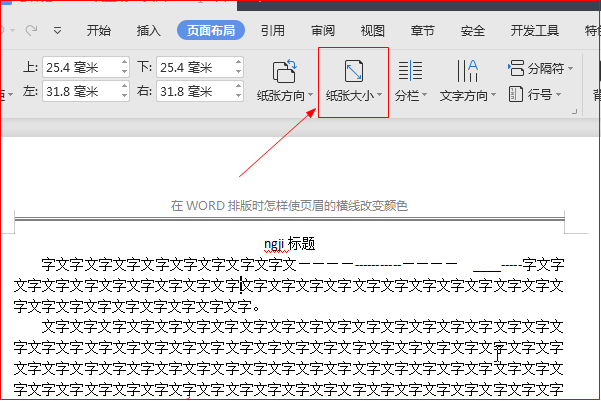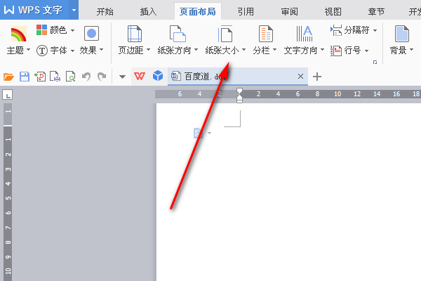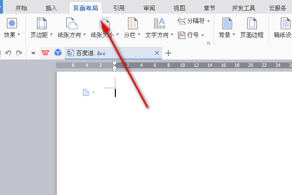 2、点击上方菜单栏项目“页面布局”,在其页面找到“纸张大小”项目。