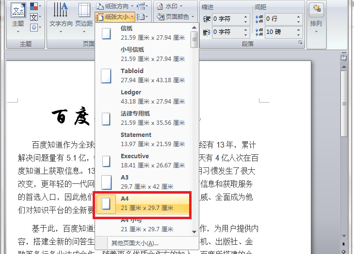 4、根据需要,选择A4纸,word文档的页面就是A4纸的大小了。