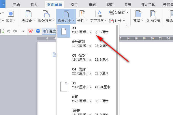 3、点击“纸张大小”,就会有纸张大小的几个选项供选择,如图所示。