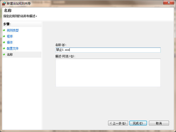 10、最后给新建的规则命名,可根据我们自己的实际情况来命名就可以了。最后点击完成按钮,重新启动电脑后,Windows10防火墙就会对刚刚指定的程序进行阻止其联网了。