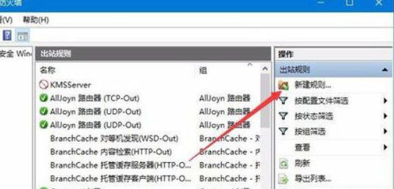 进入后有很多选项,不必慌张。点击左侧出站规则,再点击右栏的新建规则,我们新建立一条规则,以屏蔽该软件联网。