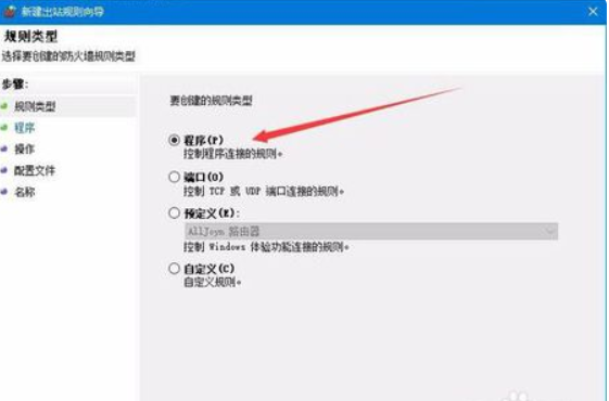 7、这时会弹出新建出站规则向导,在向导窗口中选择“程序”一项,接着点击“下一步”按钮