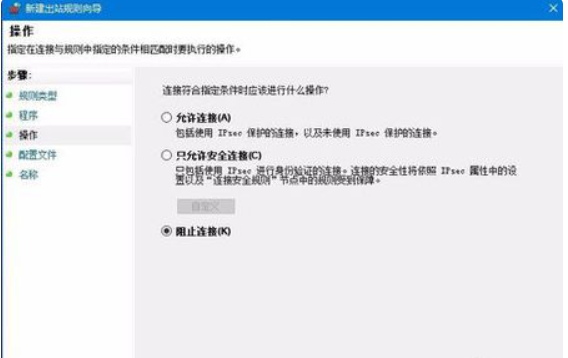 9、点击下一步按钮后,选择“阻止连接”一项,再点击下一步按钮